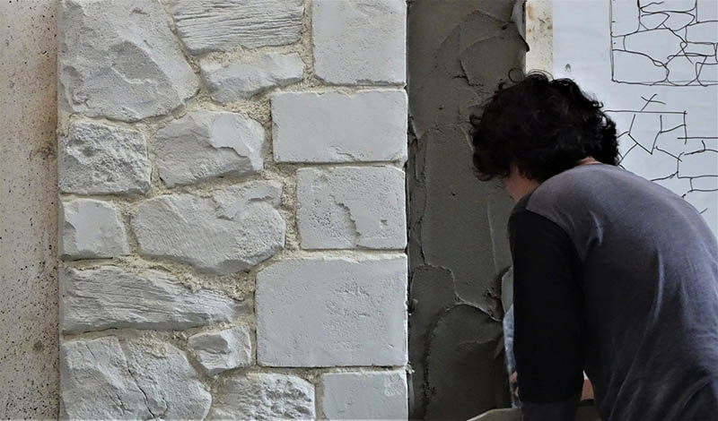 石の凹凸、表面テクスチャーや端部を1つずつ造形して色々な石の表情を、木では小口、板目、柾目、節を、いろいろな造形ツールを使いながらモルタル造形していきます。